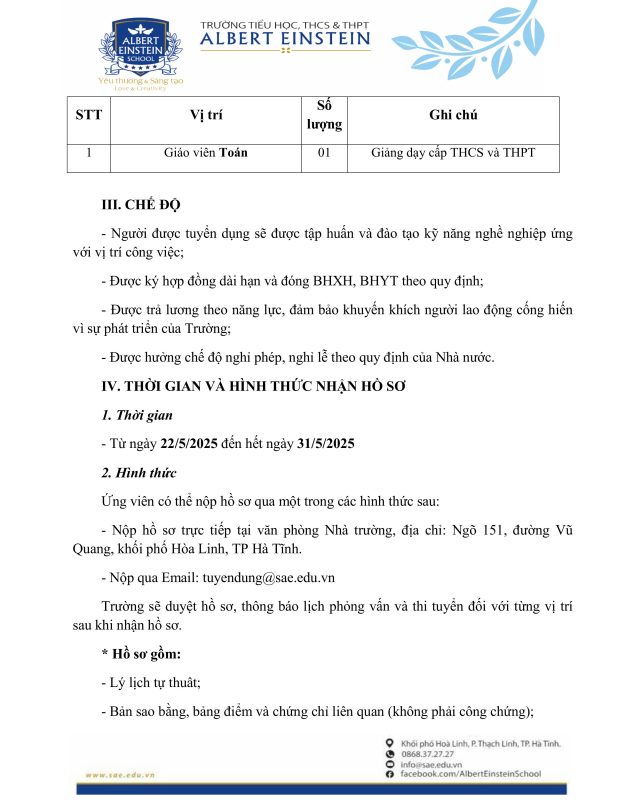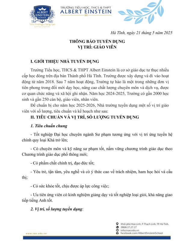 Tuyển dụng | 21 Tháng Năm, 2025 Để chuẩn bị cho năm học 2025-2026, Trường tuyển dụng một số vị trí giáo viên với số lượng, tiêu chuẩn và kế hoạch như sau: THÔNG TIN KHÓA TRẢI NGHIỆM HÈ 2025 THÔNG BÁO KẾT QUẢ TUYỂN SINH ĐẦU VÀO LỚP 6, NĂM HỌC 2025-2026