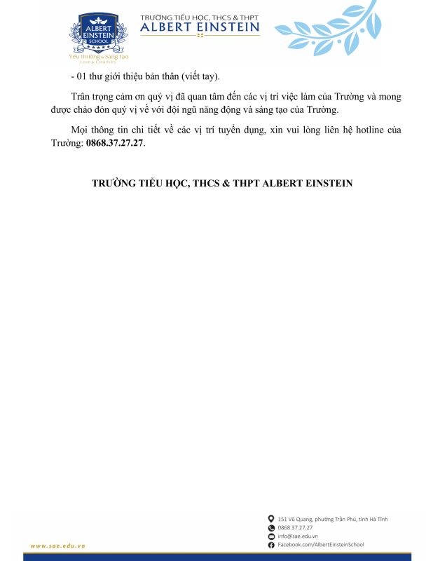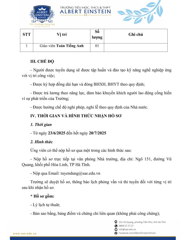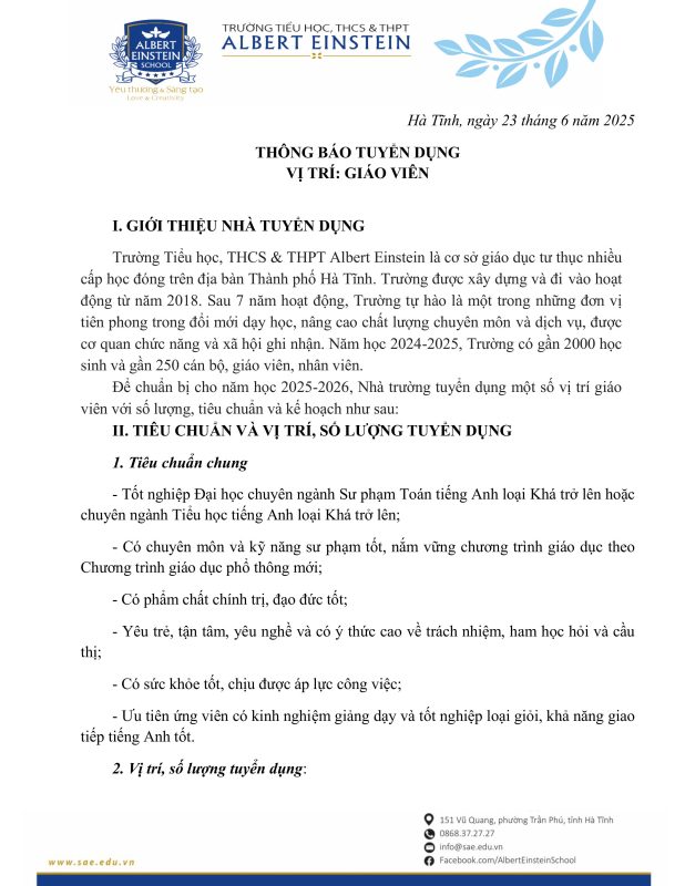 Tuyển dụng | 23 Tháng Sáu, 2025 Để chuẩn bị cho năm học 2025-2026, Trường tuyển dụng một số vị trí giáo viên với số lượng, tiêu chuẩn và kế hoạch như sau: THÔNG BÁO TUYỂN DỤNG GIÁO VIÊN TẬP HUẤN GIÁO VIÊN MỚI – SẴN SÀNG CHO MỘT NĂM HỌC BỨT PHÁ
