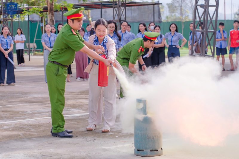 Giáo viên và nhân viên nhà trường được huấn luyện thao tác xử lý tình huống cháy nổ giả định, phối hợp cùng lực lượng chức năng sơ tán học sinh và dập tắt đám cháy.